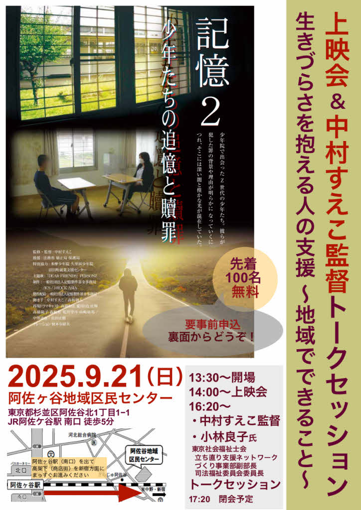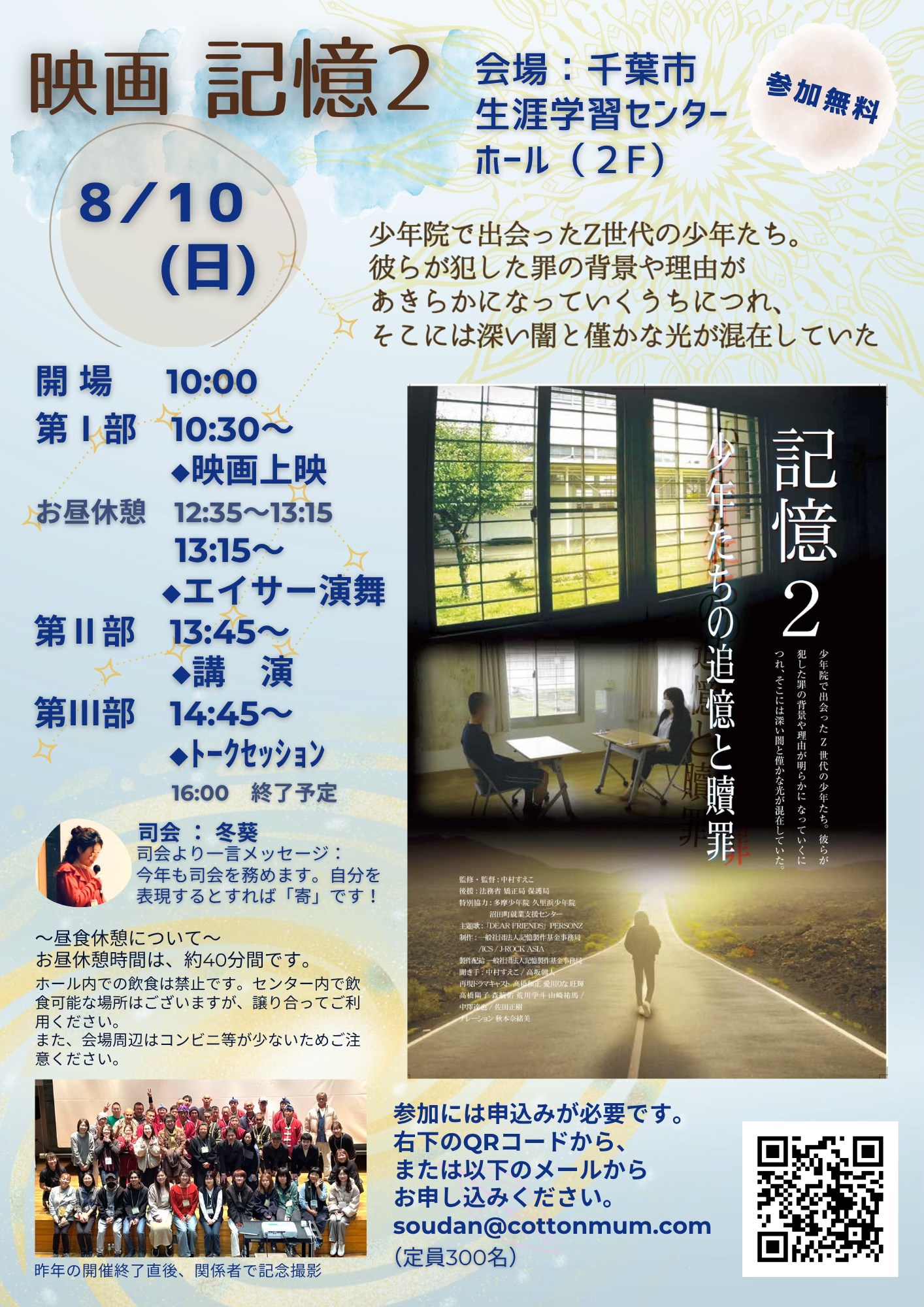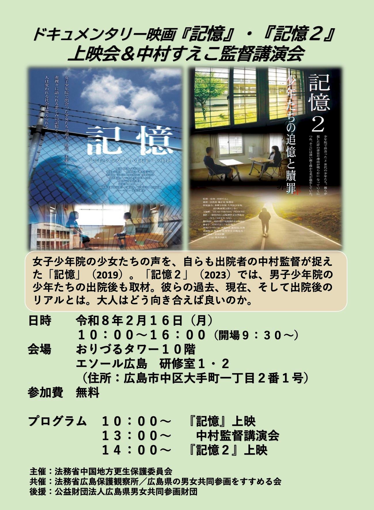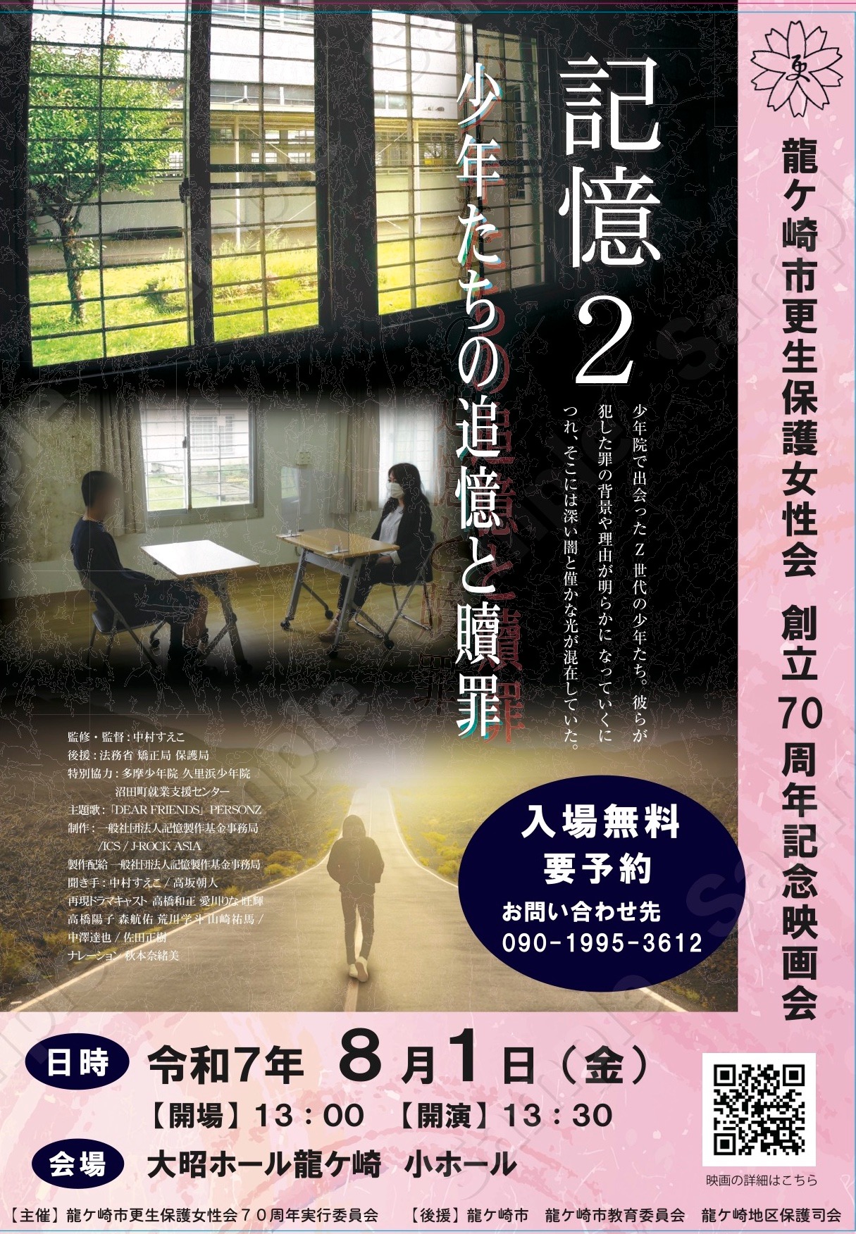 2019年7月女子少年院の少女たちのドキュメンタリー映画「記憶」は多くの人たちの協力のもとに完成しました。 社会を変えたい、その想いに賛同してくれた全国の更生保護団体、各地矯正管区や少年院の上映会は50ヵ所を超え、多くの反響をいただき社会を変える一歩になったと感じております。 そして、自らも少年院出院者である監修監督の中村すえこは、次の問いと向き合うため男子少年院で少年の心の声に耳を傾けました。少年院を出院した彼らが、なぜ再び犯罪に手を染めるのか?その問いを自ら確認するために全国の少年院を回り彼らを取材、出院後も取材を重ねました。コロナ禍で取材は中断になり、また取材対象者保護者などの同意を得るのに困難もありました。 少年たちはなぜ犯罪を繰り返すのか? そして犯罪に巻き込まれていくその背景には何が起きているのか? その時私たち大人や社会は、彼らにどう向き合えば良いのだろう? 本作では社会で起きている問題をまっすぐに捉え描くことができたと思っております。 「記憶2」が皆さんの考えるきっかけになることを願います。 インタビュアーには中村すえこの同志でもある高坂朝人氏を新たに加え、再現ドラマは前作に続き、佐田正樹、中澤達也、 秋本奈緒美 (ナレーション)をはじめとした中 村すえこの想いに賛同したキャストが演じている。 主題歌も前作同様PERSONZの代表曲でもある「DEAR FRIENDS」となり、中村すえこと製作陣やキャスト、 賛同者の想いが詰まっています。 法務省をはじめとした関係団体の協力、クラウドファンディングでのご支援、そして寄付を賜った多くの個人団体の方に賛同していただき、「記憶2少年たちの追憶と贖罪」は完成しました。