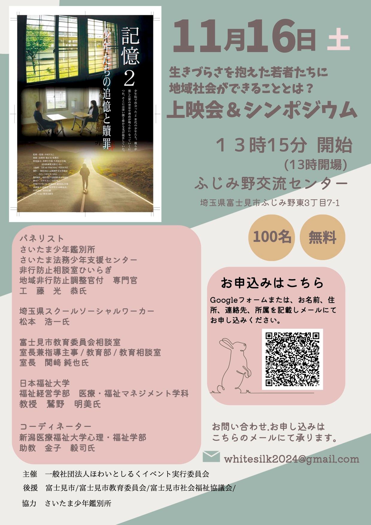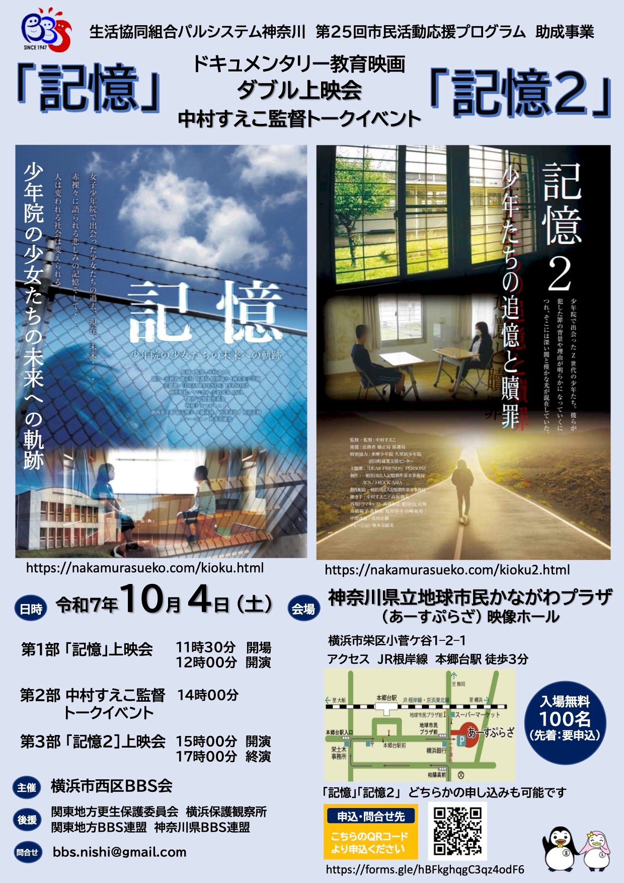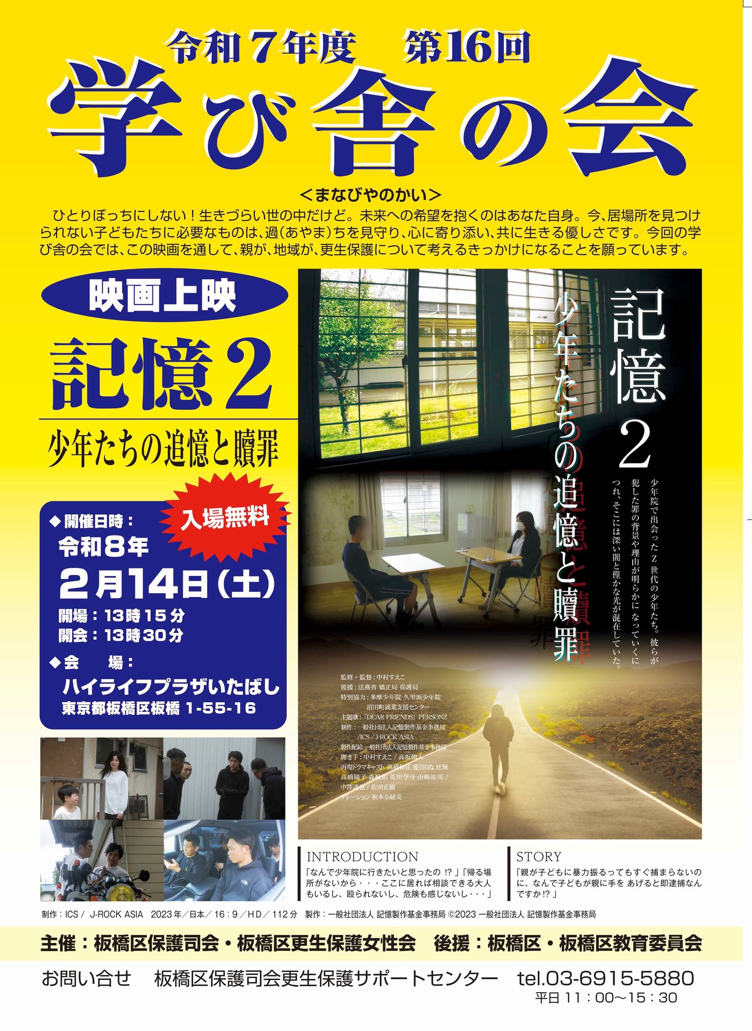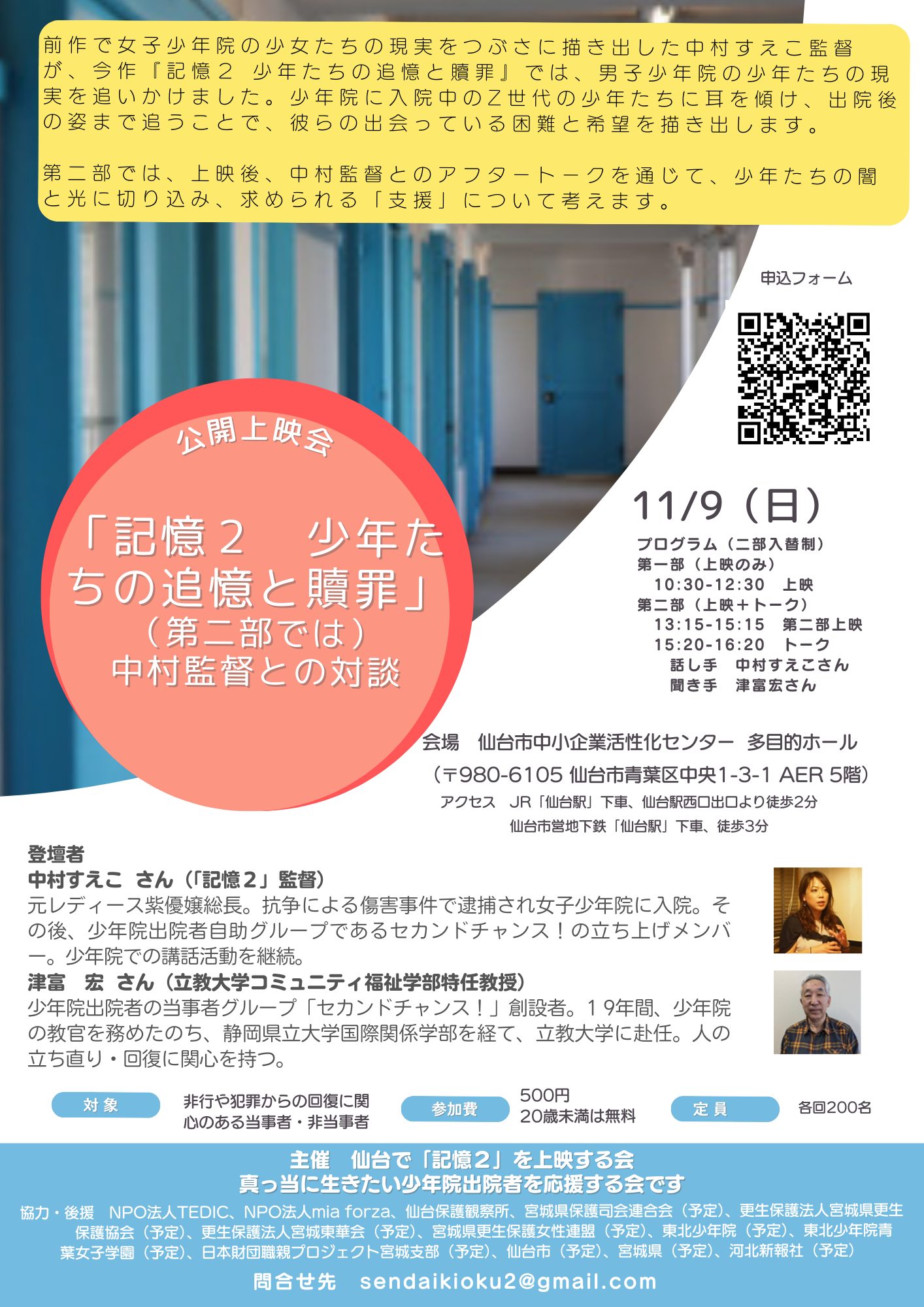 2019年7月女子少年院の少女たちのドキュメンタリー映画「記憶」は多くの人たちの協力のもとに完成しました。 社会を変えたい、その想いに賛同してくれた全国の更生保護団体、各地矯正管区や少年院の上映会は50ヵ所を超え、多くの反響をいただき社会を変える一歩になったと感じております。 そして、自らも少年院出院者である監修監督の中村すえこは、次の問いと向き合うため男子少年院で少年の心の声に耳を傾けました。少年院を出院した彼らが、なぜ再び犯罪に手を染めるのか?その問いを自ら確認するために全国の少年院を回り彼らを取材、出院後も取材を重ねました。コロナ禍で取材は中断になり、また取材対象者保護者などの同意を得るのに困難もありました。 少年たちはなぜ犯罪を繰り返すのか? そして犯罪に巻き込まれていくその背景には何が起きているのか? その時私たち大人や社会は、彼らにどう向き合えば良いのだろう? 本作では社会で起きている問題をまっすぐに捉え描くことができたと思っております。 「記憶2」が皆さんの考えるきっかけになることを願います。 インタビュアーには中村すえこの同志でもある高坂朝人氏を新たに加え、再現ドラマは前作に続き、佐田正樹、中澤達也、 秋本奈緒美 (ナレーション)をはじめとした中 村すえこの想いに賛同したキャストが演じている。 主題歌も前作同様PERSONZの代表曲でもある「DEAR FRIENDS」となり、中村すえこと製作陣やキャスト、 賛同者の想いが詰まっています。 法務省をはじめとした関係団体の協力、クラウドファンディングでのご支援、そして寄付を賜った多くの個人団体の方に賛同していただき、「記憶2少年たちの追憶と贖罪」は完成しました。